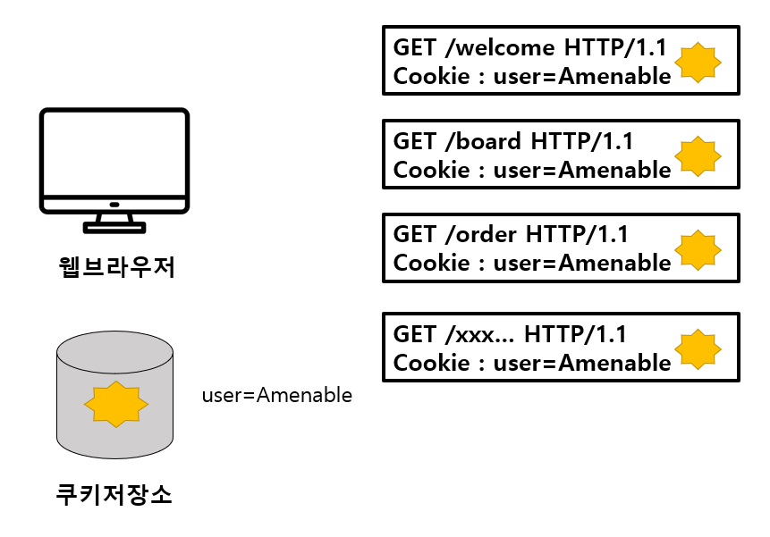 - 사용자가 별도로 요청하지 않아도 브라우저는 요청 시 요청 헤더에 넣습니다. 자동으로 서버로 전송하다.